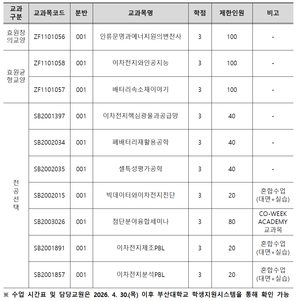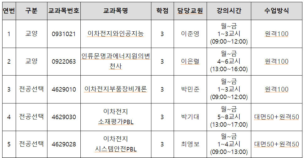 - 개설교과목 : 이차전지와 인공지능, 이차전지핵심광물과공급망, 이차전지소재분석공학, 차세대셀설계공학, 빅데이터와이차전지진단, 이차전지분석PBL