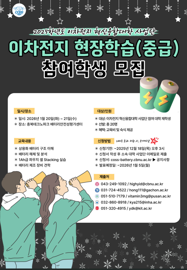 충북대에서 진행하는 이차전지 현장학습(중급) 프로그램에 대해 안내드립니다.